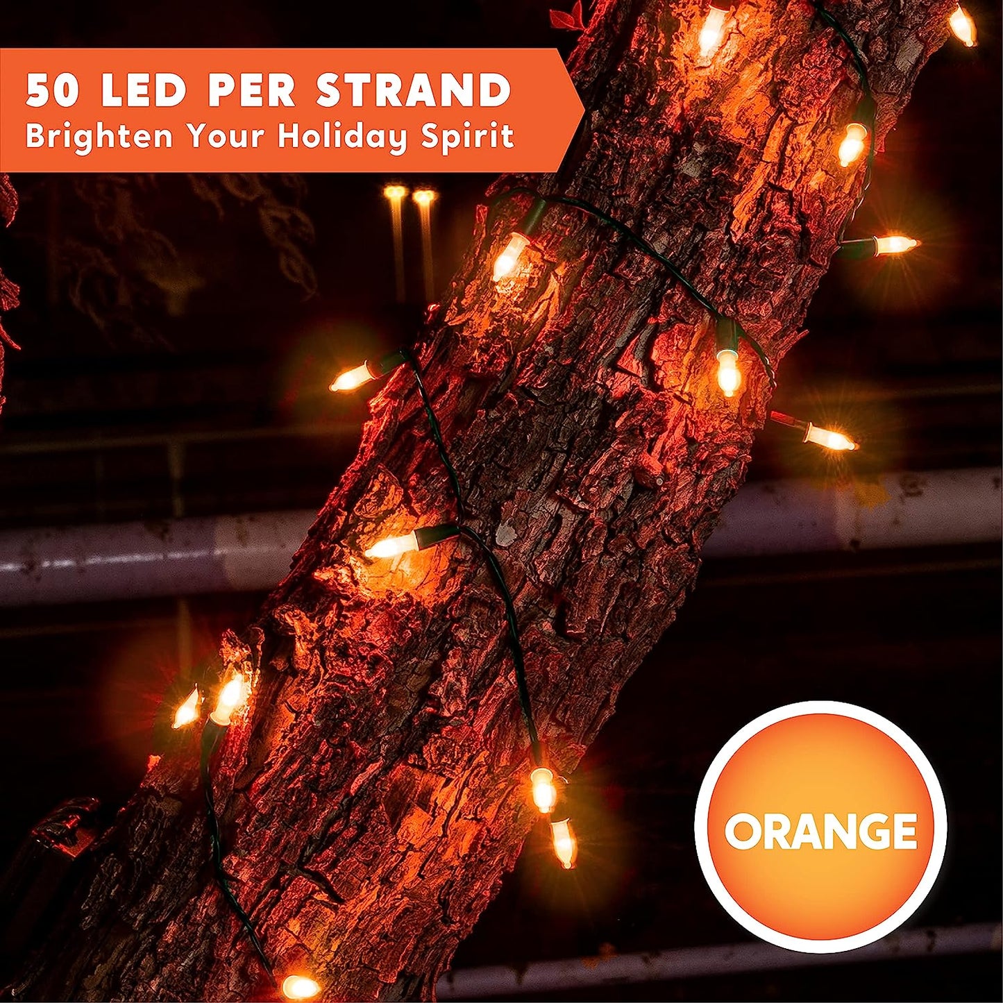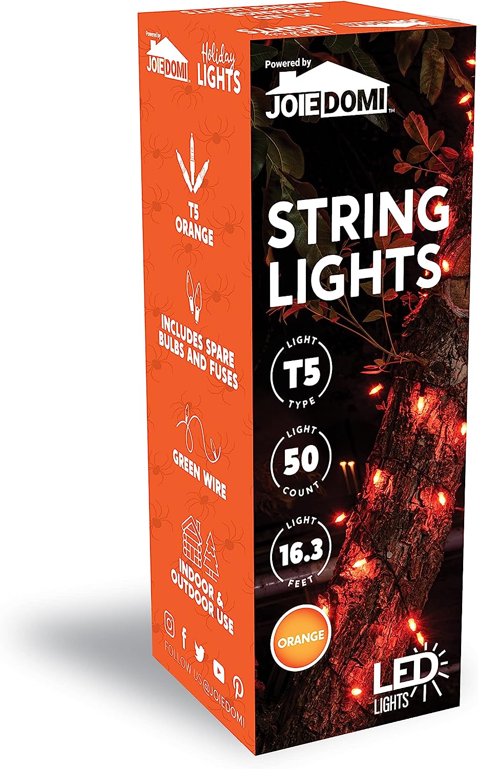 - Our Halloween LED String Lights has a total of 50 LED Orange T5 Bulbs with Green Wire. Total Lighted Length is 16.3 Feet. Total Wired Length is 17.3 Feet. Bulb Spacing 4 inches. Battery Powered.