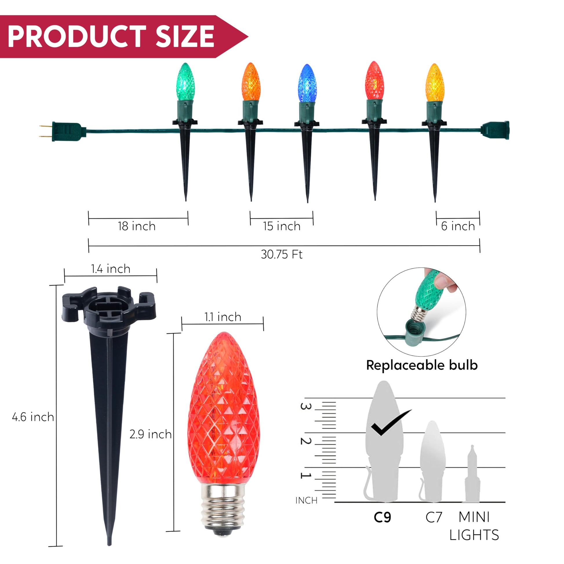 - Replaceable, Hangable, Pluggable: Provide 2 spare bulbs to install and replace, a light bulb broken does not affect other lighting bulbs. C9 LED Xmas jumbo bulbs stake lights for indoor and outdoor use for hanging and plugging; Green premium connected cable which could be hung and wrapped around any place to bright your way.