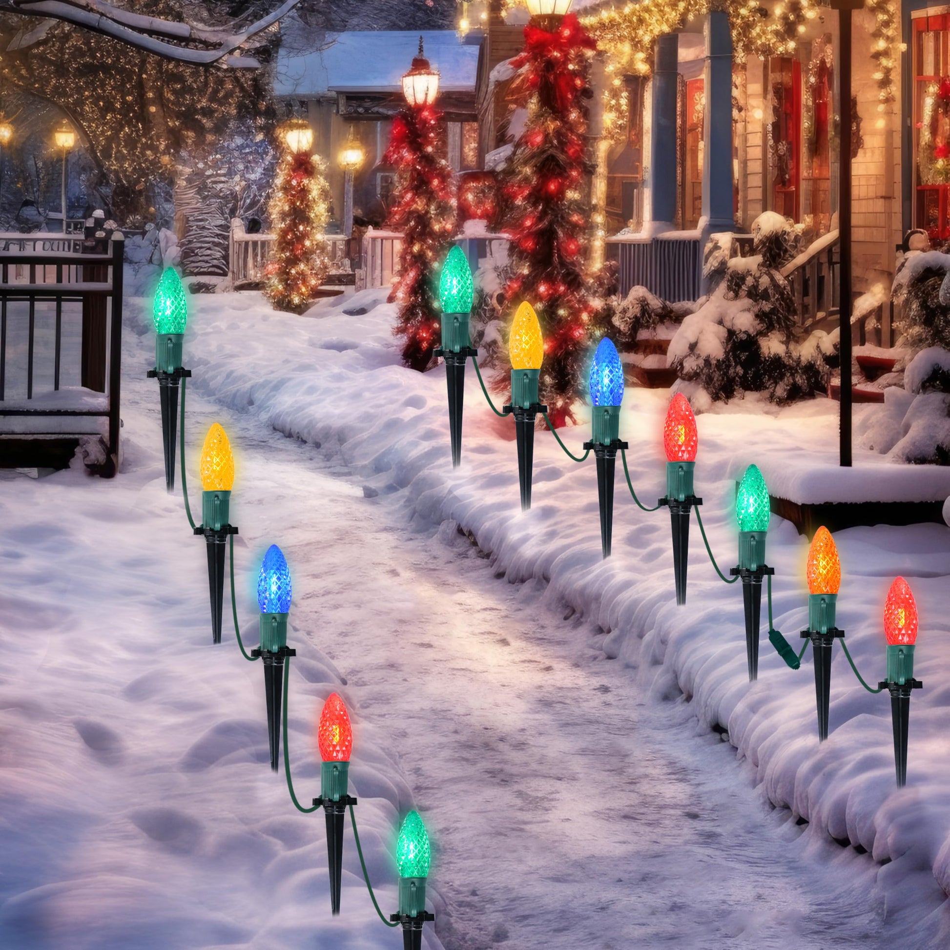 - Ambient Outdoor Lights: 30.75 feet Christmas Strawberry Pathway Stake Lights with 24 LED Walkway Lights Set include 1 Extra Fuse, 2 Spare Bulbs, 1 Male Plug, 1 Female Plug; 15 inch spacing between each C9 Walkway Light bulb, 6 inch tail with female plug and 18 inch head with male connector; Using these Colorful Christmas Yard Lights, which allows 5 colors of red, orange, yellow, green and blue to light up garden, paths, houses, etc., will create an adorable and cozy Christmas festive atmosphere.
