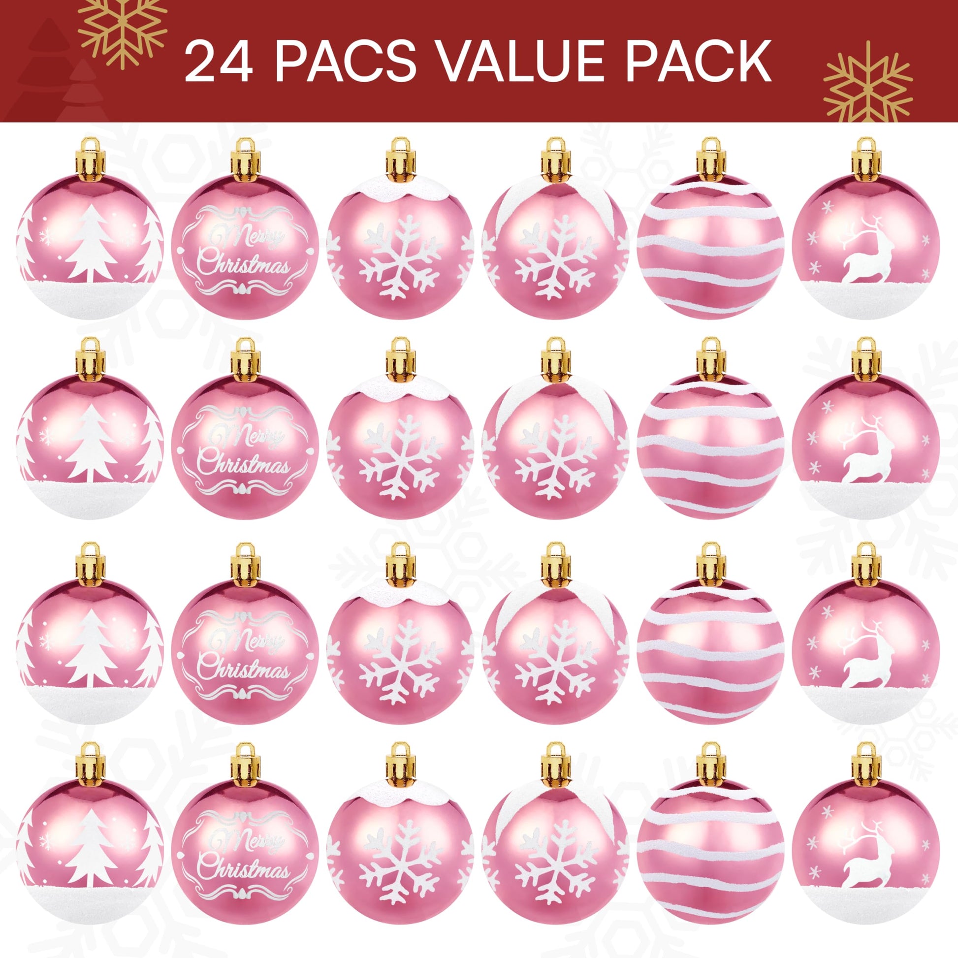 - Christmas Decoration Set: Turn your Christmas into a dazzling feast and give your holiday decorations new life! This pink and white Christmas decoration set includes 36 Christmas ball decorations, each ball is 2.3" in diameter, comes in 6 unique designs, 6 of each design, enough quantity to decorate a large Christmas tree, or for decoration Create a colorful holiday atmosphere for indoor and outdoor spaces. Enhance your holiday decor with our charming ornament set!