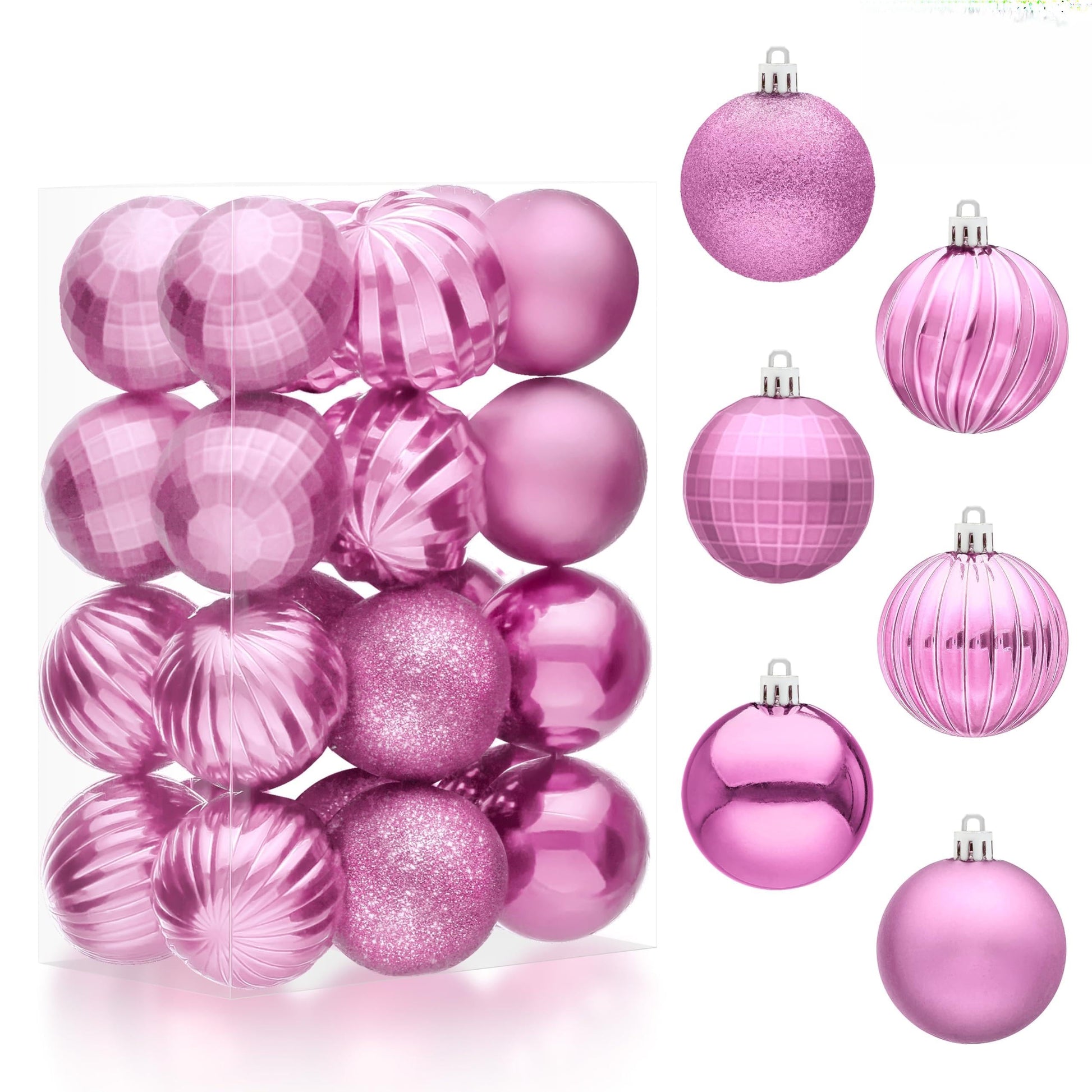- Christmas Value Pack: This Pink Christmas ornament set contains 24 Christmas ornaments and the diameter of the Christmas ball is 2.36 inches. There are 6 different types of balls in the set, including 4 glitter balls, 4 shiny balls, 4 matte balls, 4 disco balls, 4 embossed pattern balls and 4 spiral balls, which can meet your diverse needs. You can freely match your decoration needs according to your preferences, and you can make Christmas more memorable and unique.