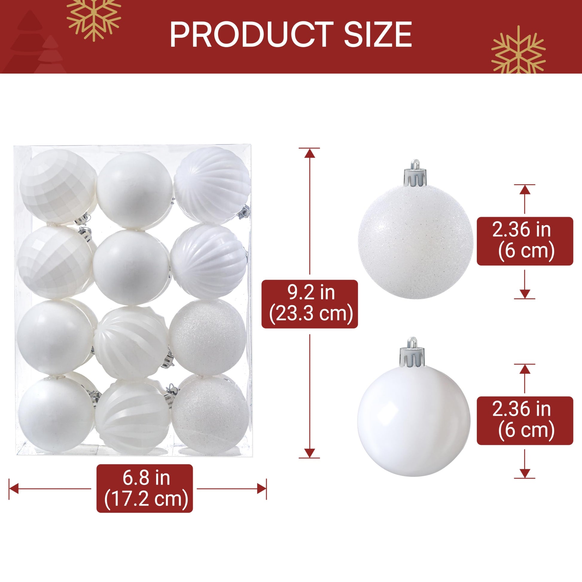 - Christmas Value Pack: This White Christmas ornament set contains 24 Christmas ornaments and the diameter of the Christmas ball is 2.36 inches. There are 6 different types of balls in the set, including 4 glitter balls, 4 shiny balls, 4 matte balls, 4 disco balls, 4 embossed pattern balls and 4 spiral balls, which can meet your diverse needs. You can freely match your decoration needs according to your preferences, and you can make Christmas more memorable and unique.