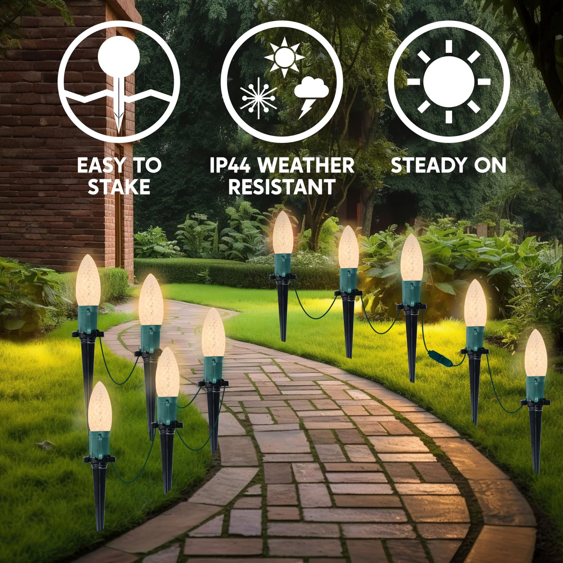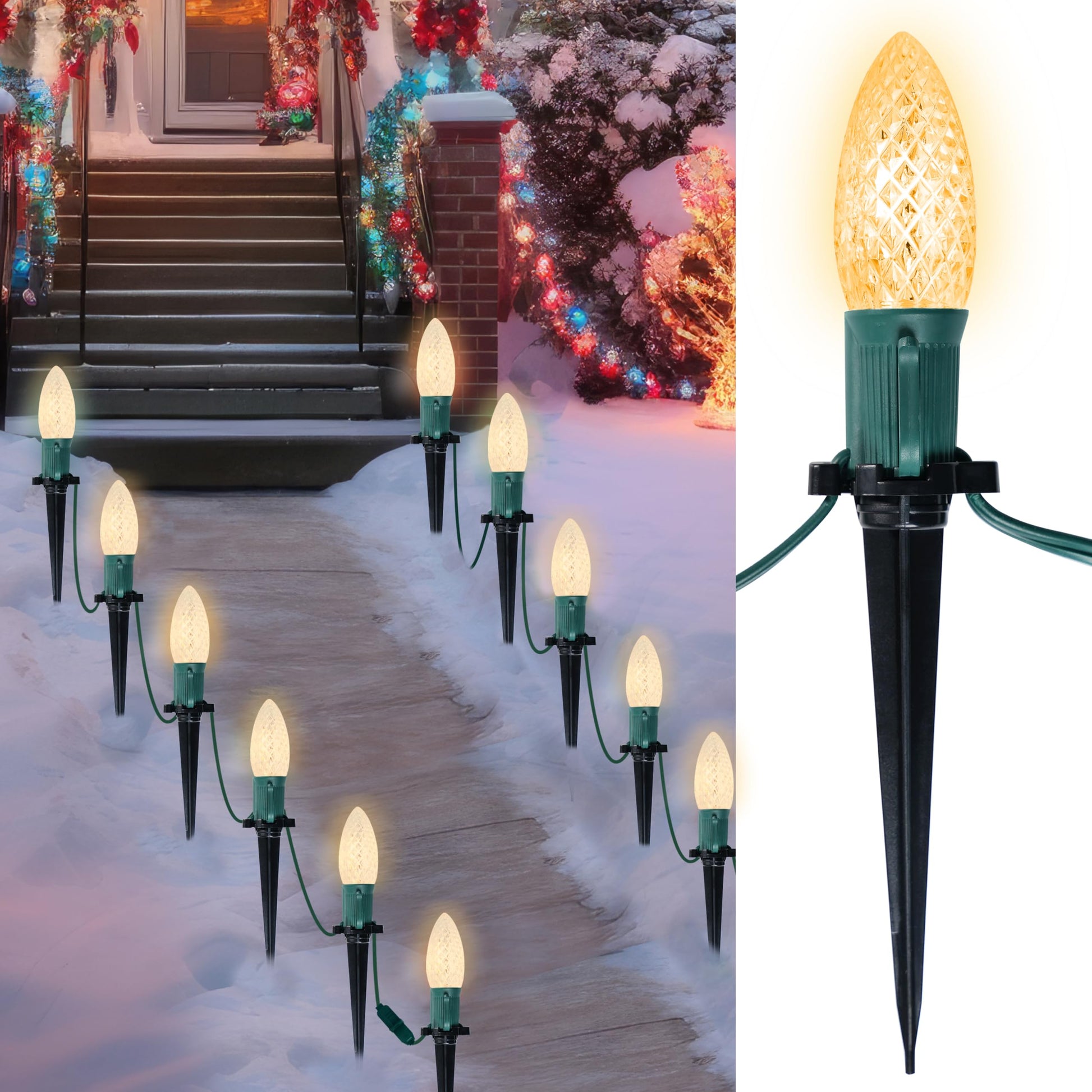 - Applicable Occasion: C9 Warm White Stake Lights for driveway, pathway, walkway, patio, home, roof, lawn, balcony, porch, garden, bistro, pub, cafe, restaurant, shopping center, supermarket, gathering, disco ball party, dinner party during Christmas, Halloween, Thanksgiving Day, New Year, Winter and Party. Separate your personal area with bright gorgeous light to create a Christmas and holidays atmosphere. NOTE: The AC plug is NOT Waterproof, it should be protected from rainyday.