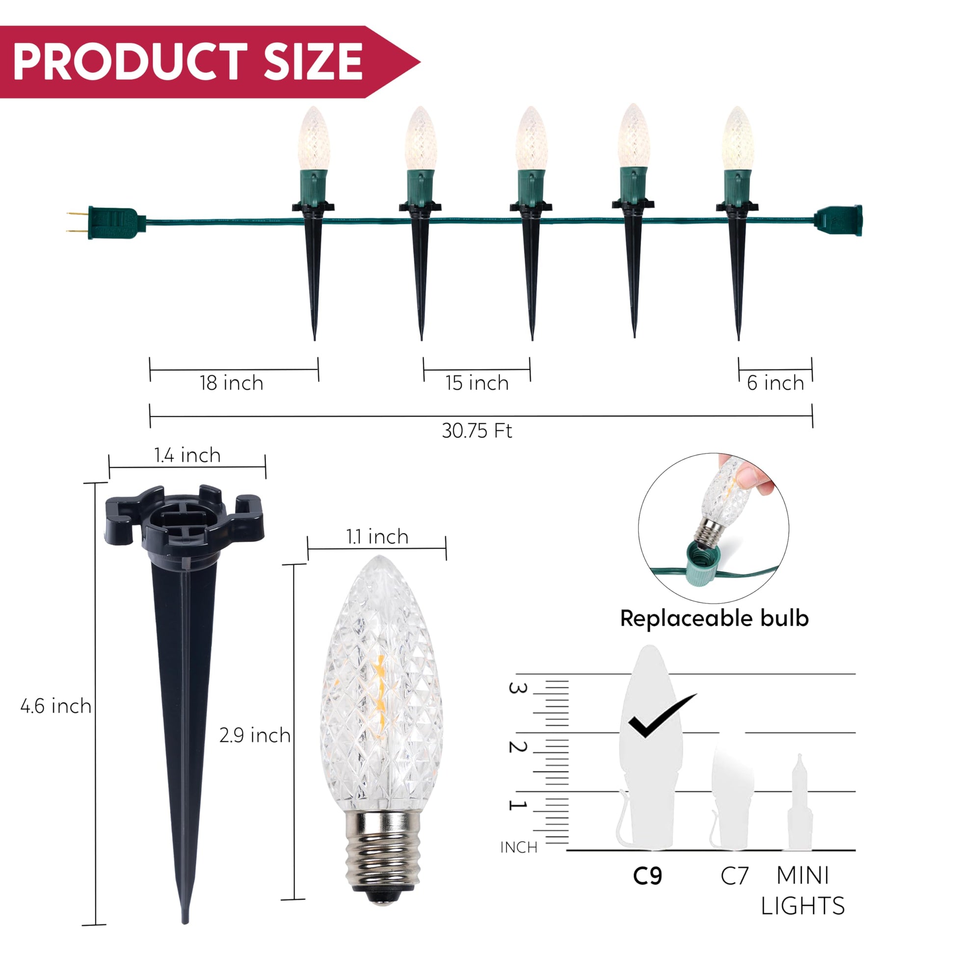 - Replaceable, Hangable, Pluggable: Provide 2 spare bulbs to install and replace, a light bulb broken does not affect other lighting bulbs. C9 LED Xmas jumbo bulbs stake lights for indoor and outdoor use for hanging and plugging; Green premium connected cable which could be hung and wrapped around any place to bright your way.
