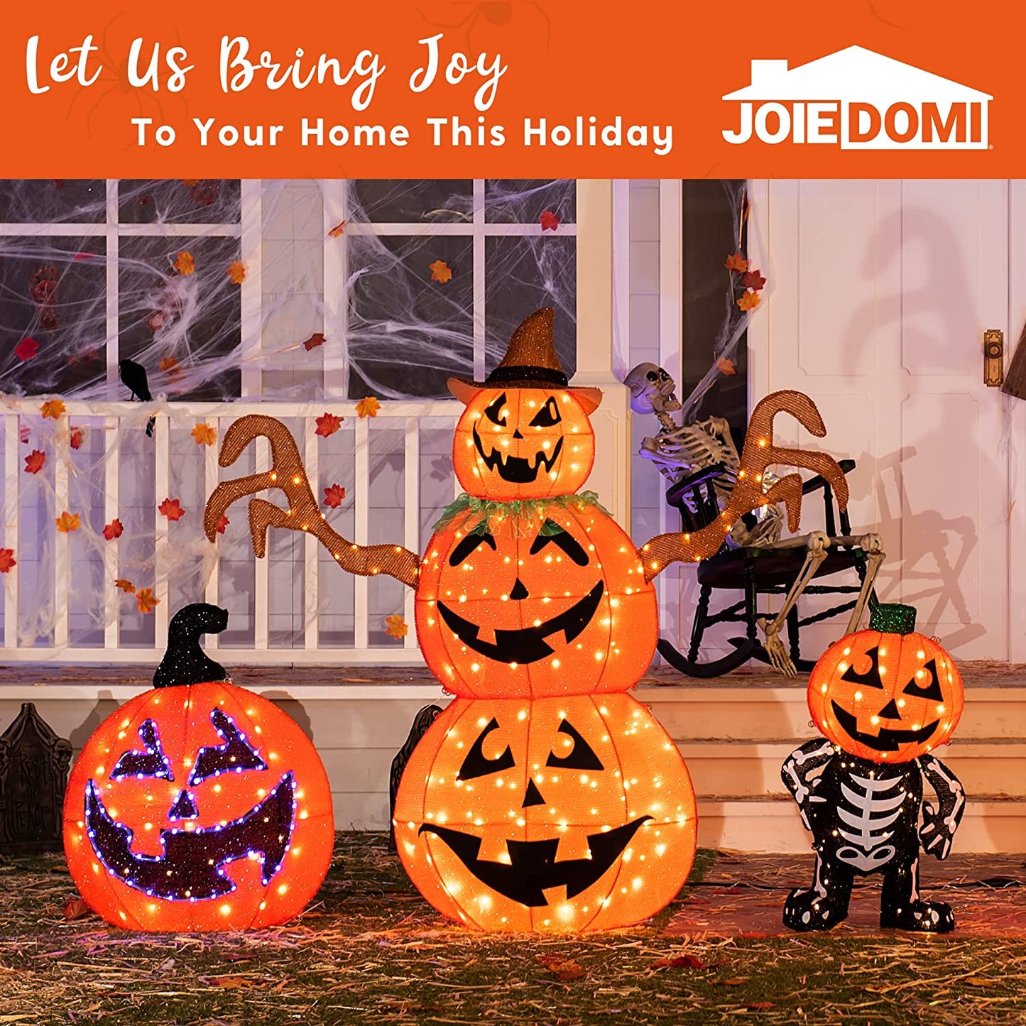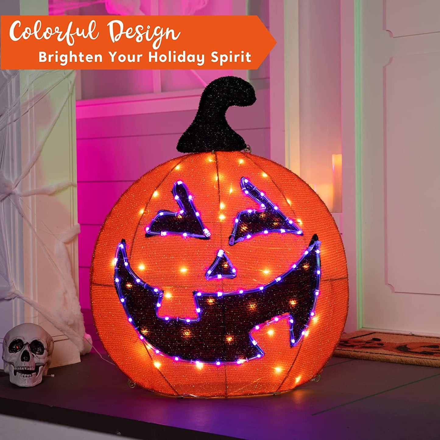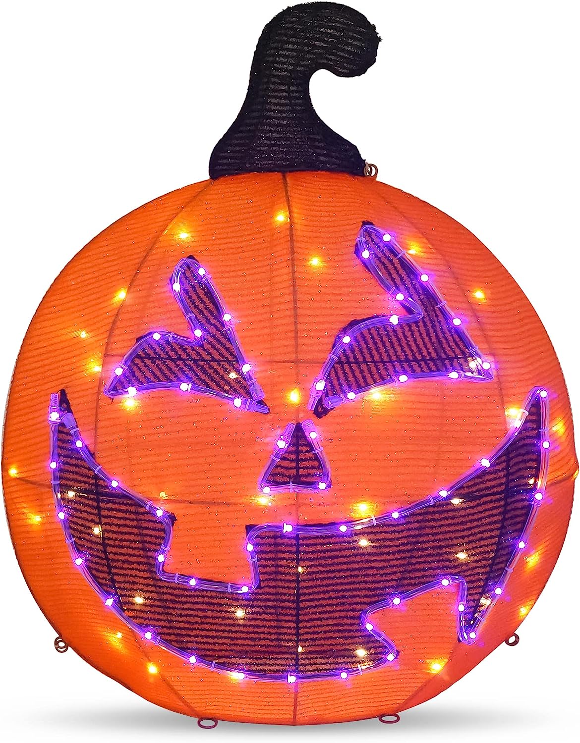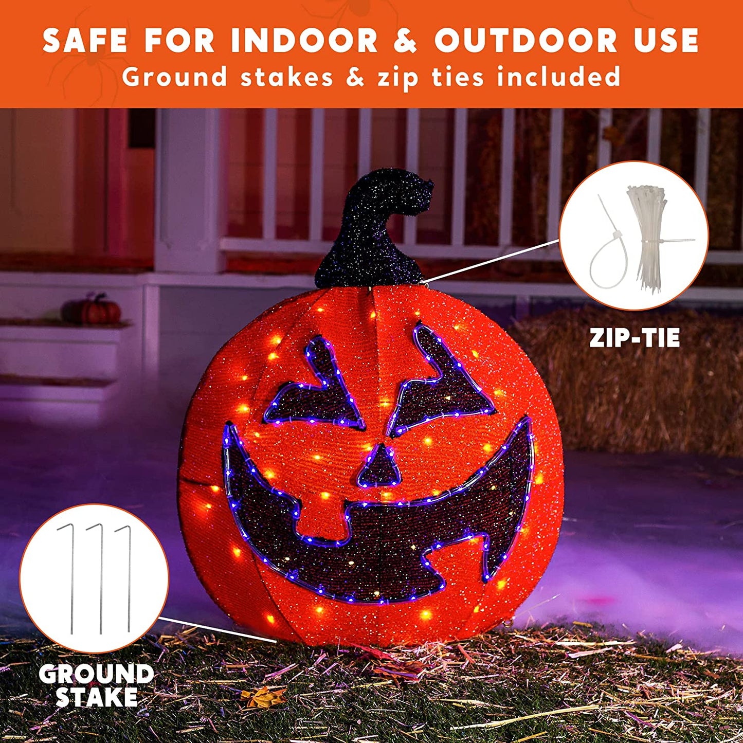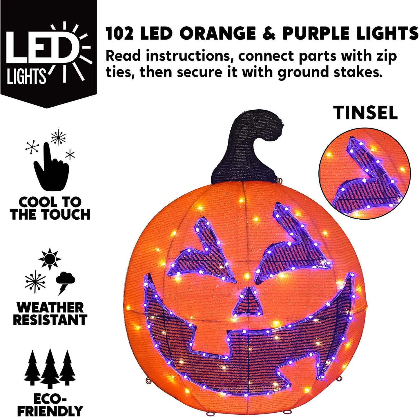 - Our Halloween LED Yard Lights includes a 2.5 Feet Tall Pumpkin with 102 LED Orange & Purple Lights in Clear Wire, 4 Metal Stakes, and Zip Ties. Made of Metal Frame and Tinsel Fabric.