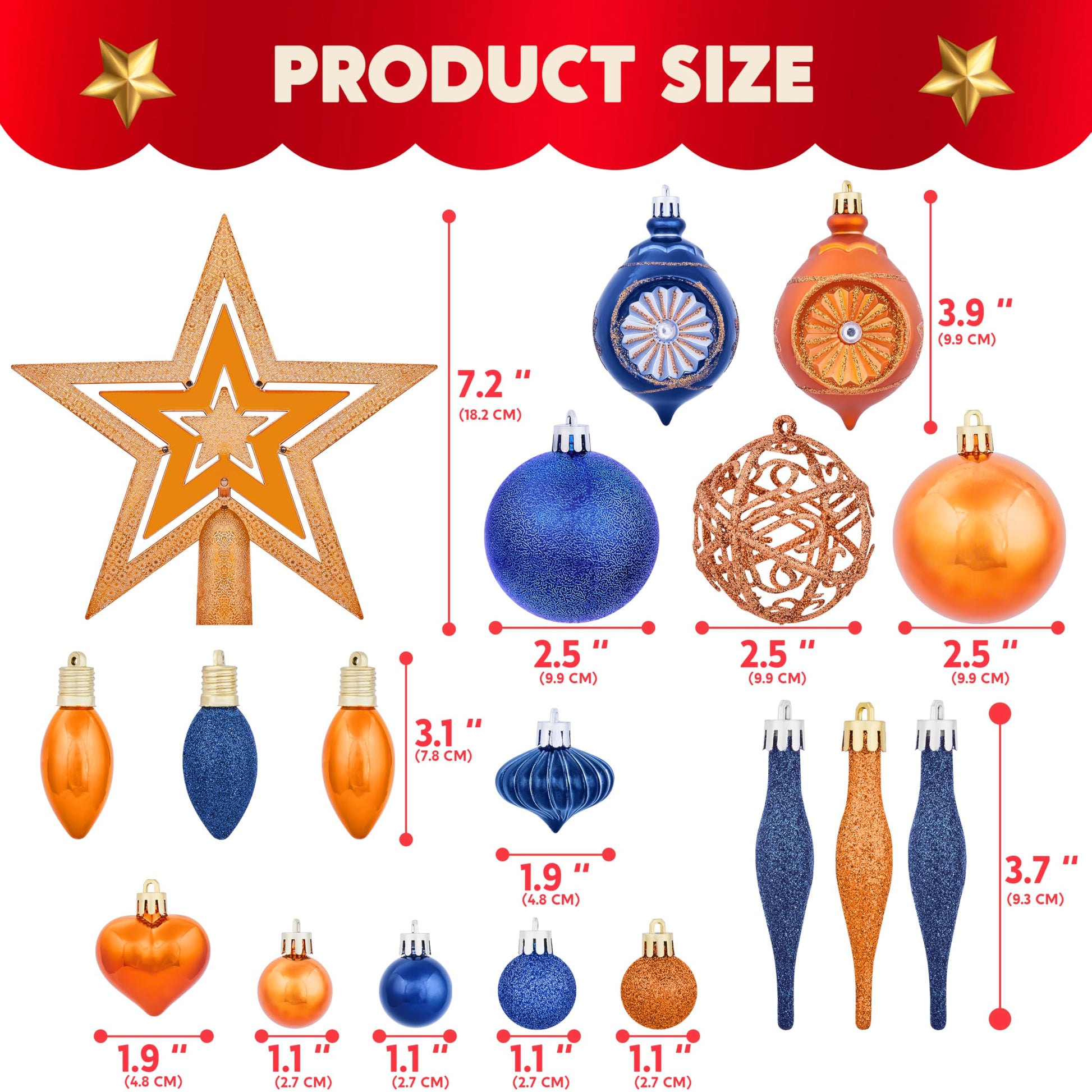- Create Unforgettable Christmas Memories: Everyone longs for Christmas because it is a season full of warmth, joy and togetherness. Our Christmas ball decorations will bring you more joy, more laughter, and create unforgettable memories for you and your family. The combination of blue and orange will add more highlights to your holiday and create an intoxicating Christmas atmosphere. Elevate your holiday decor with our diverse range of Christmas ball decorations to create a magical and joy-filled atmosphere that will be the talk of the season!
