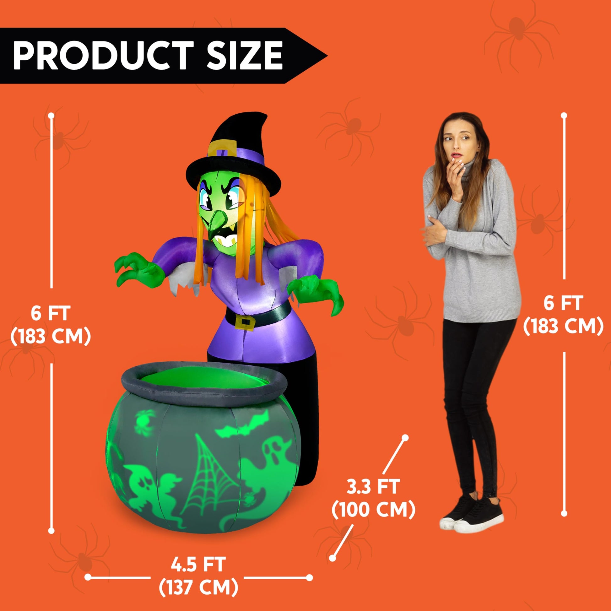 - Unique Design. 6 Ft Halloween Inflatable Witch and Cauldron with Green Ghosts Light comes with extended cords, ground stakes, fastened ropes, built-in sandbags, and a plug with UL certification.Product size 4.5 x 3.3 x 6 feet.