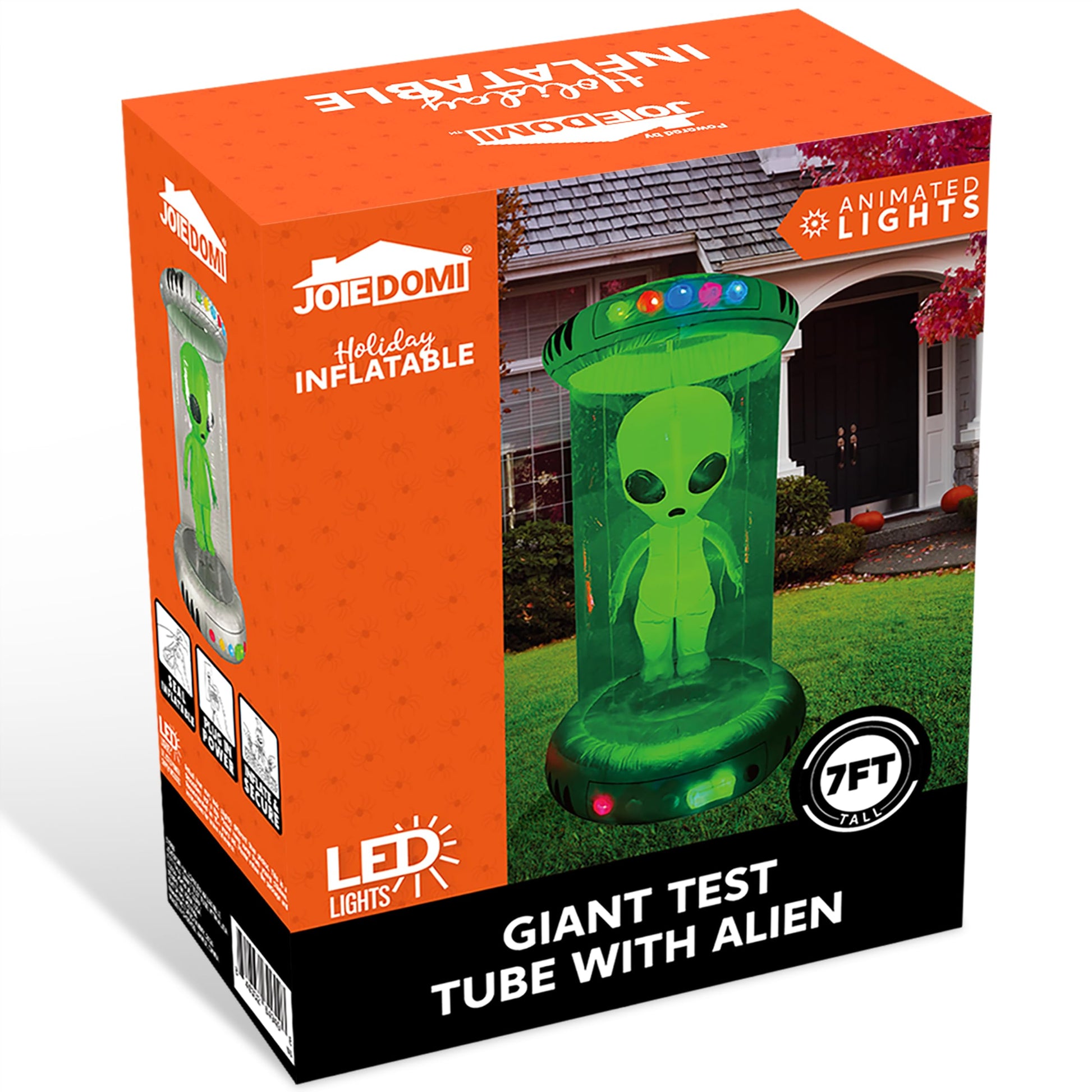- Stunning Design. This 7ft tall Halloween inflatable Test Tube with Alien is a sight to behold. Its unique design features an alien creature encased within a towering test tube, capturing the attention of people who see it. The attention to detail is impeccable, from the alien's intricate features to the vibrant colors that bring it to life. Product size 4 x 4 x 7 feet. This inflatable comes with an extended cord, ground stakes, fastened ropes, built-in sandbags, and a plug with UL certification.