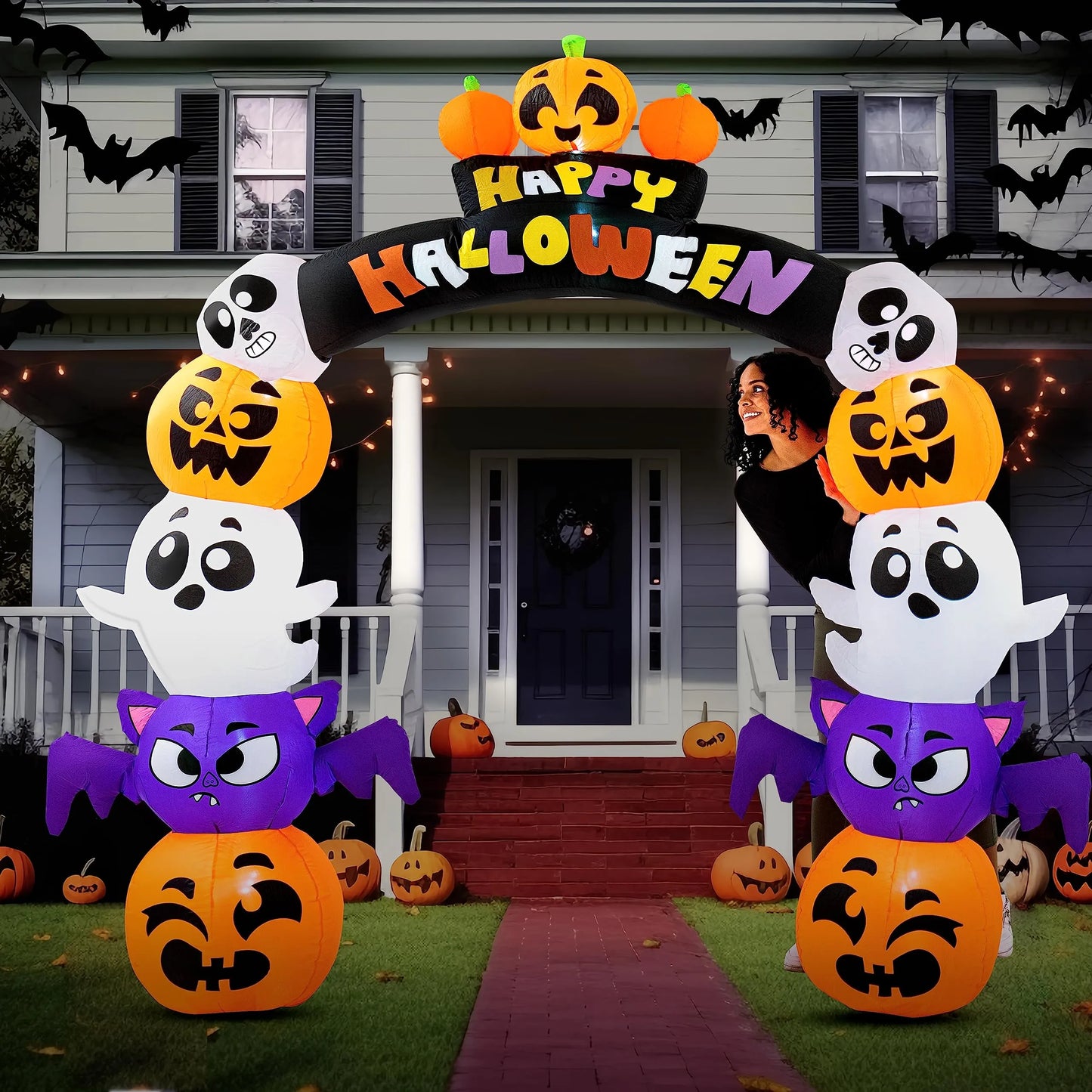- Our 8 Feet tall stack character pumpkin archway inflatable comes with extended cords, ground stakes, fastened ropes, built-in sandbags, and a plug with UL certification.