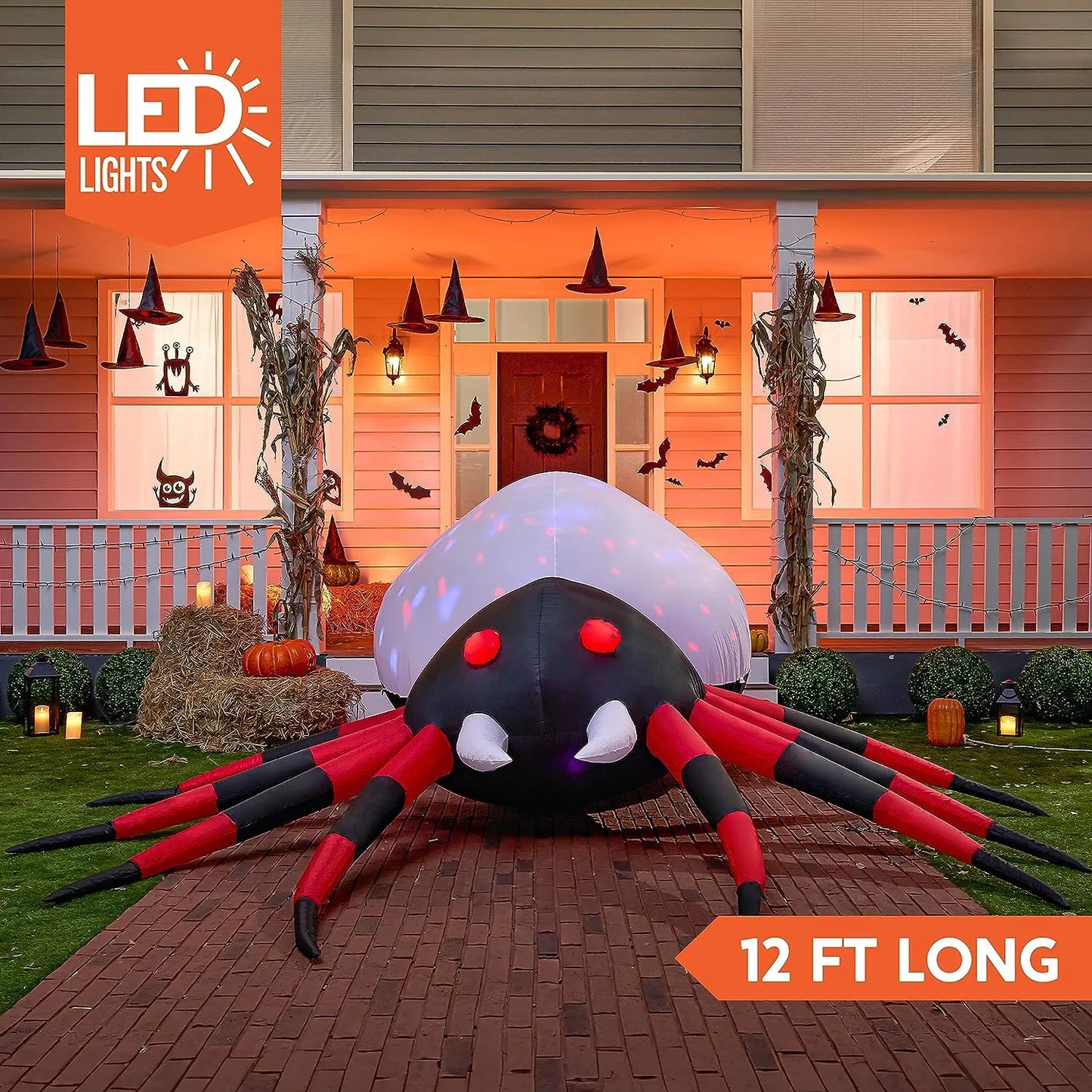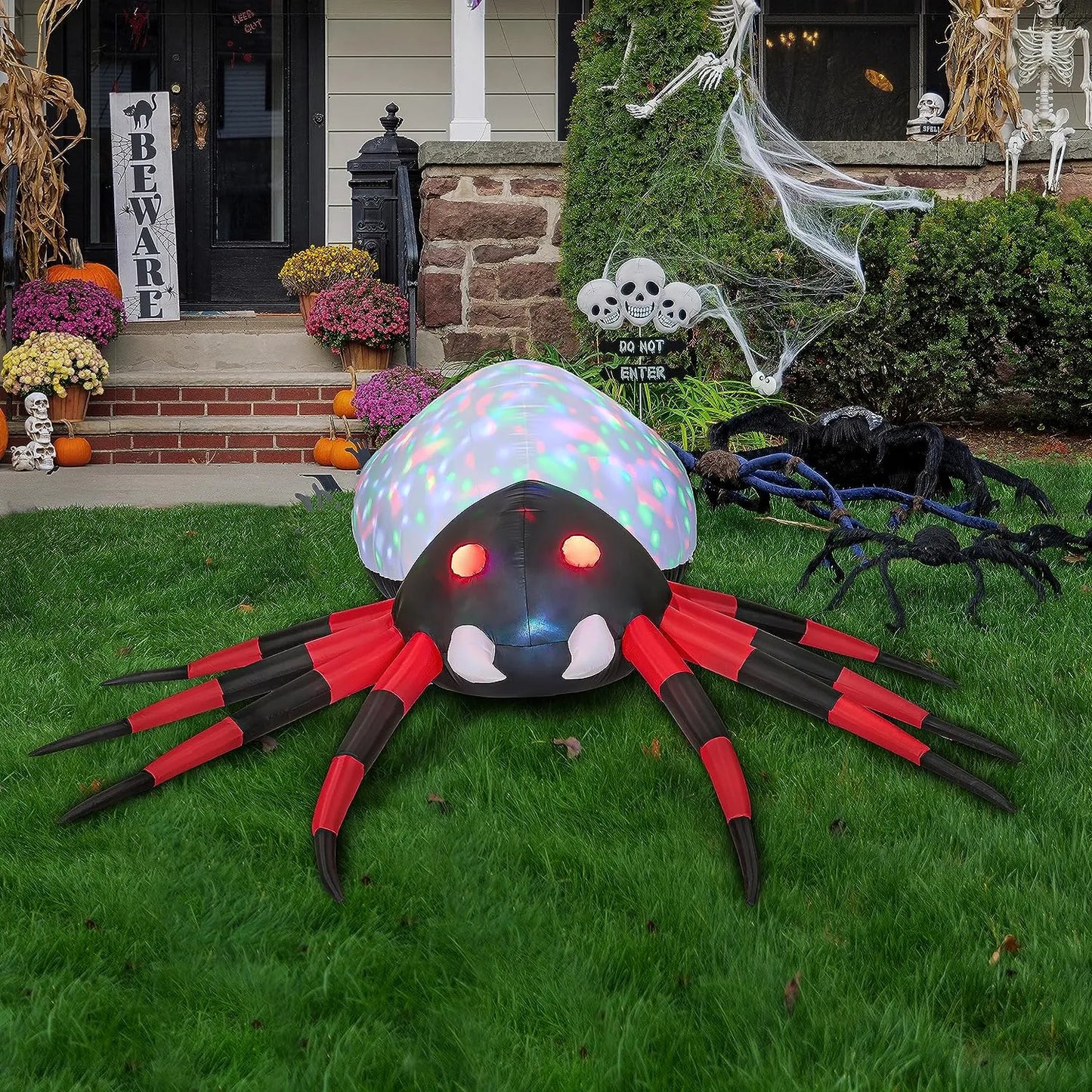 - Excellent Design. This 12ft Halloween inflatable spider decoration boasts a striking design that is sure to grab attention. With its large size and intricate details, it adds a spooky touch to any Halloween display. The rotating colorful lights create a novel and unique visual effect. This inflatable comes with an extended cord, ground stakes, fastened ropes, built-in sandbags, and a plug with UL certification.