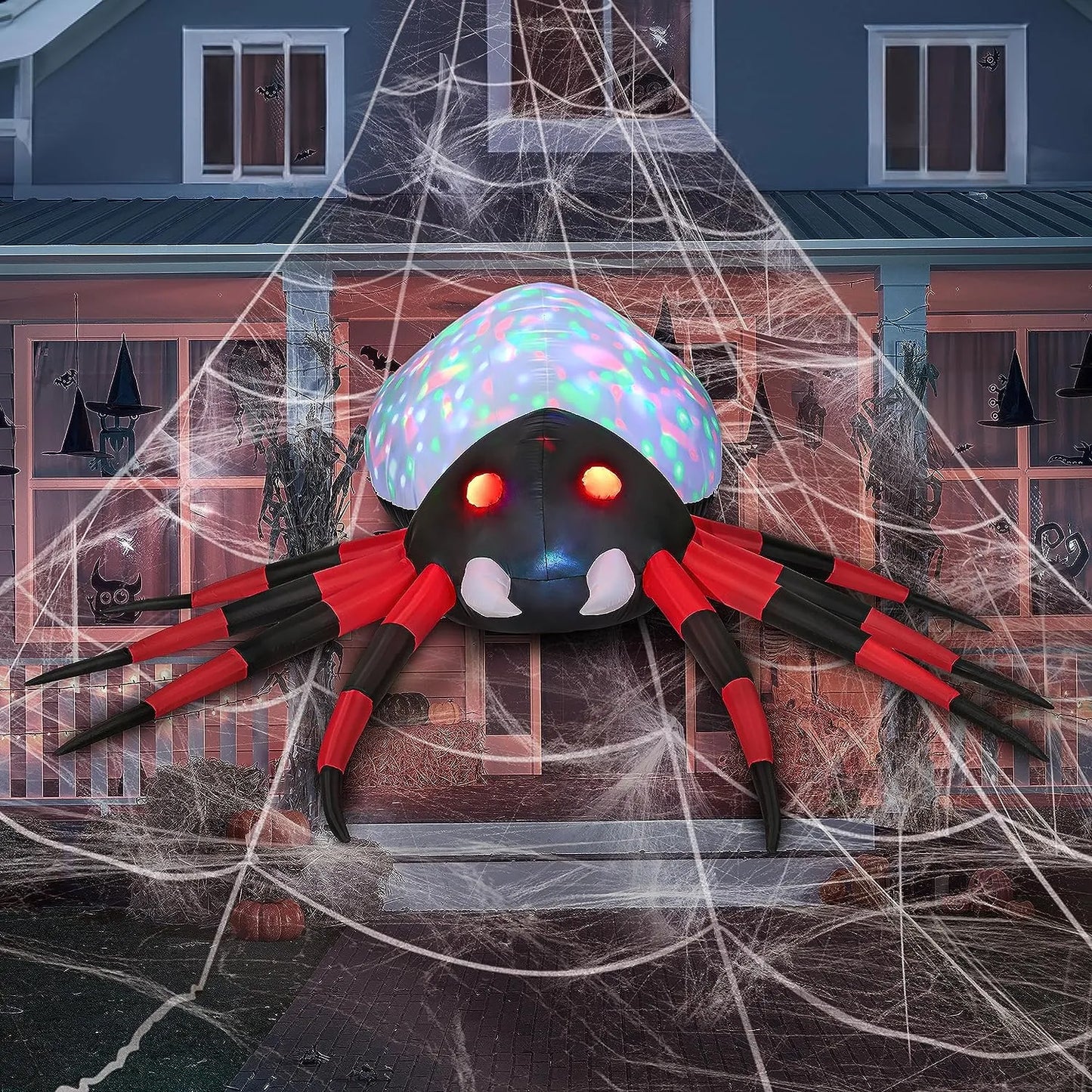 - Powerful Functions. This blow up inflatable spider decoration is not just visually appealing but also comes with powerful functions. The spider's stomach is adorned with colorful lights and eyes are adorned with red light, enhancing its overall appeal and making it stand out in the dark. The rotating colorful lights create a mesmerizing display, adding an extra level of excitement to your Halloween setup. Besides that, the spider's legs are red and black and look huge and scary.
