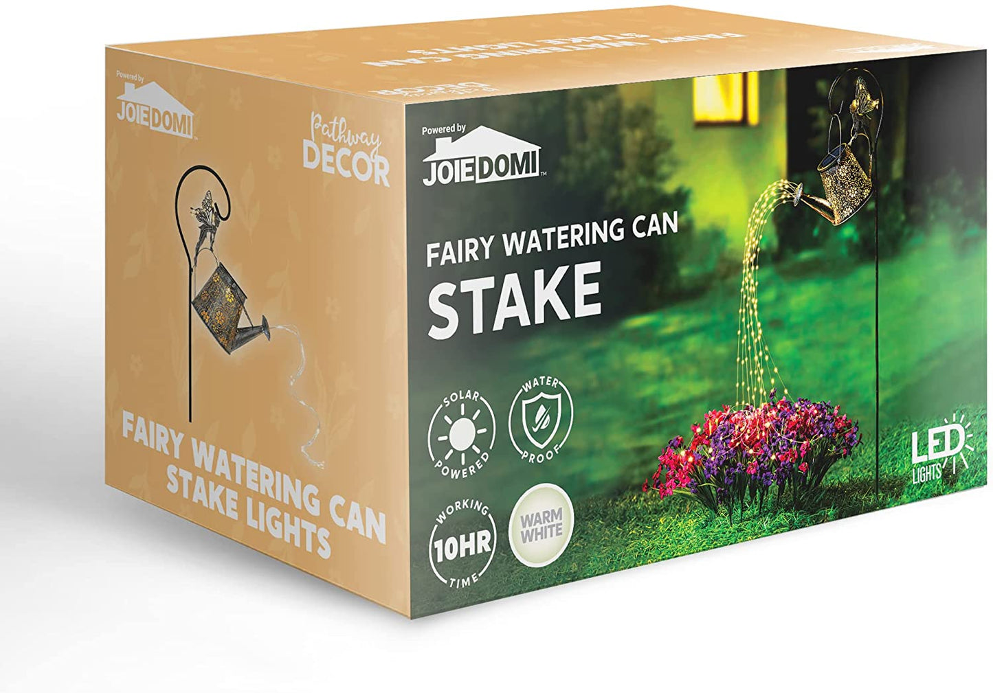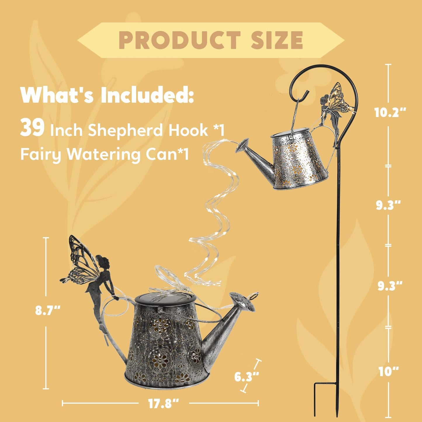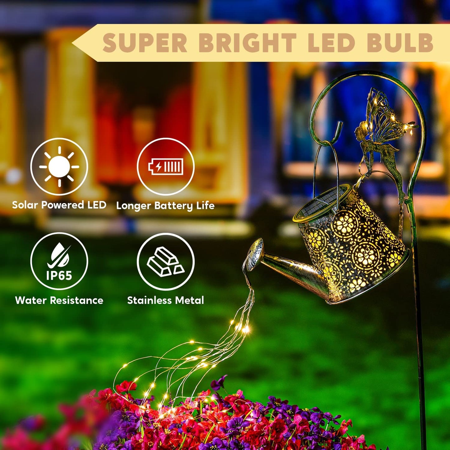 - These decorative water cans outdoor features super bright & long-lasting solar LED bulbs with shepherd hook set decorative solar light. This watering can outdoor set comes with 1 warm bright light LED bulb,10 pack string lights, with extended shepherd hook length to 30 inches. No power cord is needed! Awesome outdoor decor that provides up to 10hrs of light after fully charging in sunlight for 6hrs.